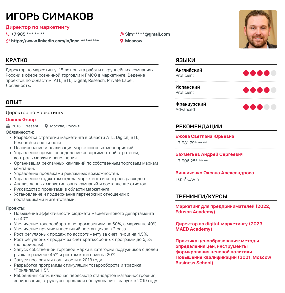 Резюме (и другие материалы) сформированы под задачу: грамотно структурированы, релевантны под конкретную должность и роль, легко читаемы, составлены с учетом работы алгоритмов джоббордов